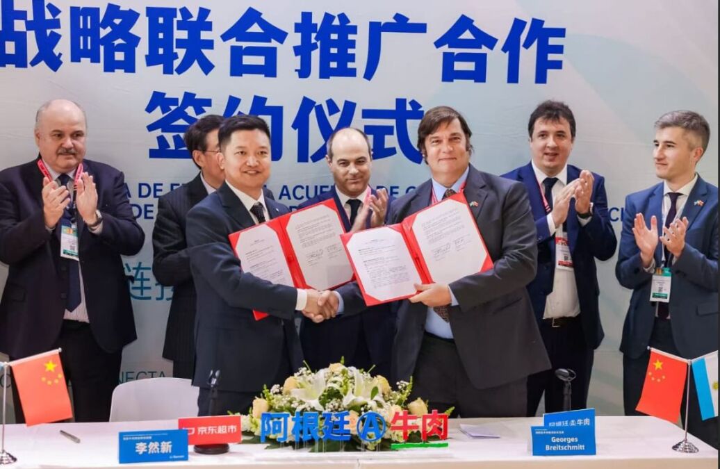 El convenio fue rubricado por Georges Breitschmitt, presidente del IPCVA, y Li Ranxin, gerente general del Negocio de Carnes Vacunas y Ovinas de JD.COM, durante la gran feria en la que el Instituto participa junto a 26 empresas exportadoras en el imponente pabellón Argentine Beef de 1.150 m².