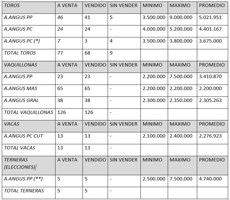 (**) Se vendieron dos terneras al 50% en 5 y 4 millones respectivamente.