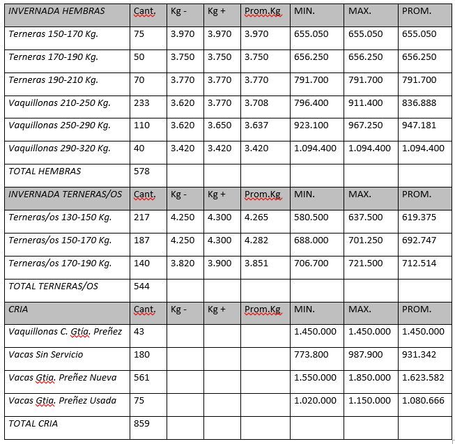 Una vez más los novillitos de más de 250 kg sorprendieron en valores, mientras que los de más de 200 kg tuvieron precios hasta 4270$. La hembra se sostuvo encima de los 3700$, mientras que macho y hembra promediaron los 3800$. Para finalizar, los vientres nuevos treparon por encima del 1.8 millones de pesos.
