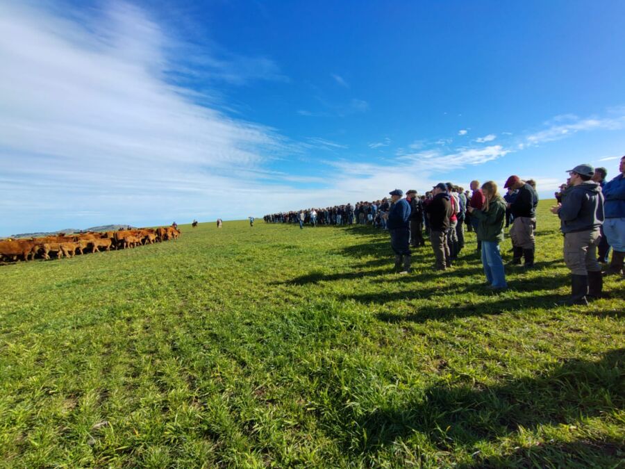 Me rio para adentro y comienzo con el repaso, allá en Montana es difícil que esto ocurra. Son 600-700 tipos todos dispuestos a ir hasta un campo. Se abrazan, se ríen a carcajadas, hablan a los gritos, pero a los pocos minutos los envuelve la calma y señalan una vaquillona. Entre lo poco que entiende seguramente verá que esos dos tipos que hace un rato parecían familiares, hablan de fechas de parto, del tamaño del ternero, de la unformidad del tamaño y otro se suma para mostrar agachándose y arrancando del suelo, algo de la pastura implantada. Y si bien, Mark Tatarka es Veterinario, su familia hizo tambo por más de 50 años, nunca vio nada igual, “Estos tipos alucinan”, me atrevo a pensar al mirarlo por debajo de su gorra, casi más prolija, que su peinado.