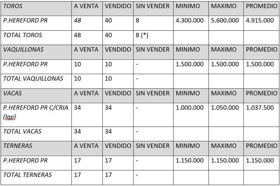Casi cinco millones de pesos sin dudas es un buen número para 40 toros Hereford vendidos que mas allá de cualquier valor sigue trabajando muy fuerte en genética funcional tras tantos años de selección. “Nos caracteriza una una genética de rodeos más que una genética de individuos, y así viene la selección de lo que ofrecemos. Por eso la uniformidad y el tipo de animal tan parejo” sentenció.