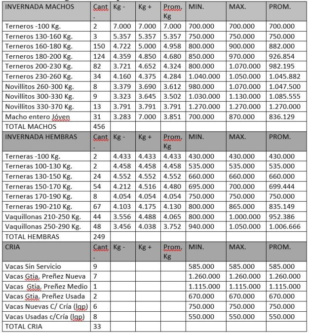 Con una invernada muy ágil y con mucha gente interesada, con operadores también en el teléfono, más los presenciales, el remate tomó valores por demás interesantes, “el ternero anduvo sobre los 4.800- 4.700- 4.800 hasta 5.000$ un ternero de 180 kilos, entre medio el novillito de 250- 260Kg también sobre 4.600-4.500$ y el ternero liviano siempre se sale un poquito de relación con también cerca de 5.000 pesos y algún lote de ternero muy liviano que por ahí no es para tomar tan en cuenta que anduvo sobre los 6.800-7.000$ el kilo pero era un lote chico y muy livianito” marcó al ver valores realmente que impresionan.