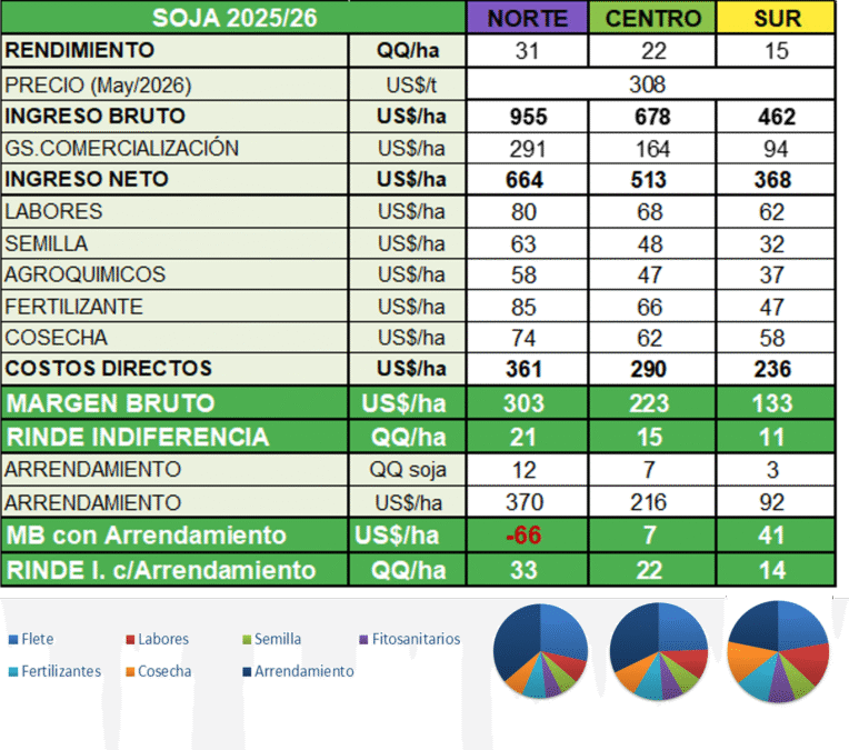 Para el cálculo del MB de soja se consideró un valor de venta a futuro de 308 u$s/tn (mayo/2026). El planteo incluyó la siembra directa de semilla RR con una aplicación de fertilizante fosforado, variando la dosis según zona. Se consideró una aplicación aérea (fungicida) y cuatro terrestres para la zona norte, cuatro pulverizaciones terrestres en la zona centro, y tres en la zona sur. Se contempló una densidad de siembra de 80 kg/ ha en la zona norte, 60 kg/ha en la zona centro y 40 kg/ha en la zona sur.