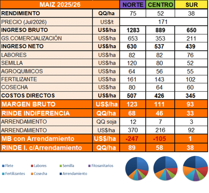 Para el cálculo del MB de maíz, se consideró un valor de venta a futuro de 171 u$s/tn (julio/2026). El planteo incluyó la siembra directa de híbridos VT3P, aplicaciones de fertilizantes nitrogenados y fosforados (a la siembra), con dosis diferenciadas según zona. Para norte y centro se consideró la realización de cuatro pulverizaciones, mientras que para la sur se consideraron tres. Se contempló una densidad de siembra de 60.000 pl/ha (zona norte), 40.000 pl/ha (zona centro) y 26.000 pl/ha (zona sur).