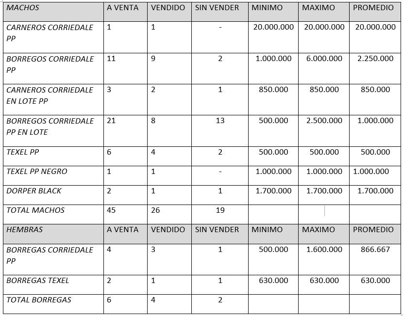 Las ventas del corriedale tuvieron su tarde, con martillo de Luciano Janyistabro, el Gran campeón de Aldazabal tuvo sus pujas y su buen valor: unos 20 millones de pesos fueron pagados por el “Ruso” Jorge Meier de Cabaña Don Reinaldo, cuya sangre del gran campeón, pertenece a su propia cabaña.