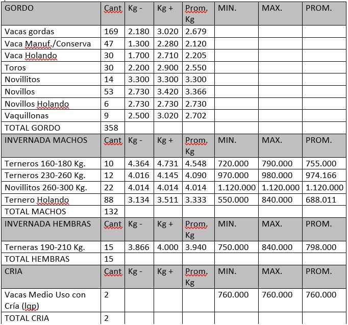 Como cada mes la firma Gregorio Aberasturi realizó sus ventas en Carhue, con buenos valores para el consumo liviano, máximos de hasta 3420$.