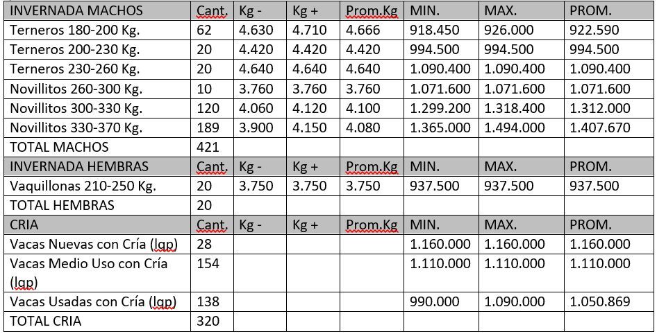 Se realizó el remate de la firma Vittori-Ercazti, remate que no llegó a los 800 vacunos, mostrando sin dudas la firmeza de una escases de animales, producto de la retención que la zona permite. Mucho ternero pesado, novillito y todo, absolutamente todo arriba de los 4000$ en el precio al kilo.