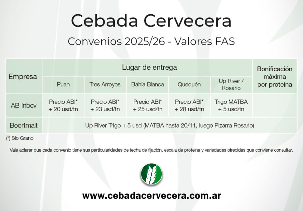 Respecto a condiciones, para cebada cervecera, para el ciclo 2025/26 se han presentado las siguientes opciones bajo convenio: