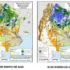 Al comienzo de la perspectiva continuarán produciéndose precipitaciones muy desparejas, con registros abundantes sobre gran parte del NOA, el sur de la Región del Chaco, el norte de la Mesopotamia y el extremo norte de la Región Pampeana, mientras gran parte del Paraguay, gran parte del centro de La Argentina y la mayor parte del Uruguay recibirán aportes escasos.