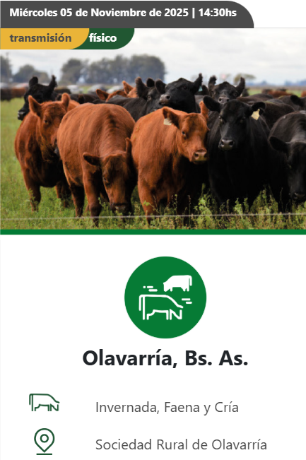 Agenda de Remates VENTAS DE LA 79° EXPOSICIÓN RURAL DE CORONEL PRINGLES GANADERA SALLIQUELO EN CONJUNTO CON BERNARDELLI PIROLA 20 de octubre de 2025 14:00 hs. SOCIEDAD RURAL DE CORONEL PRINGLES 2392 61-3596 Enviar E-Mail Sitio Web MADELAN EN LA WEB GORDO, INVERNADA Y CRIA 21 de octubre de 2025 09:30 hs. WEB PROPIA - MADELAN 2983 40-7854 Enviar E-Mail Sitio Web GANADERA SALLIQUELO EN SALLIQUELO GORDO, INVERNADA Y CRIA 21 de octubre de 2025 15:00 hs. SALLIQUELO 2392 62-9069 Enviar E-Mail Sitio Web 1° REMATE ANUAL DE CABAÑA DON REINALDO VENTA TOTAL DE PRODUCCIÓN CORRIEDALE PP 22 de octubre de 2025 14:00 hs. SOCIEDAD RURAL DE BAHIA BLANCA - STREAMING 2916 42-0950 Enviar E-Mail Sitio Web GREGORIO ABERASTURI EN CARHUE GORDO, INVERNADA Y CRIA 22 de noviembre de 2025 15:00 hs. SOCIEDAD RURAL DE CARHUE 2923 45-8153 Enviar E-Mail Sitio Web NESTOR HUGO FUENTES EN GENERAL ACHA REPRODUCTORES Y VIENTRES DEL CALDENAL 22 de octubre de 2025 14:00 hs. PREDIO NESTOR HUGO FUENTES 2954 47-8046 N/D Sitio Web MARTIN Y ALONSO EN HUANGUELEN ESPECIAL DE GORDO 22 de octubre de 2025 10:30 hs. HUANGUELEN - FERIA MARTIN Y ALONSO +54 9 2923 64-1340 Enviar E-Mail Sitio Web VITTORI ERCAZTI EN LA WEB INVERNADA Y CRIA 23 de octubre de 2025 09:30 hs. PLAZA GANADERA 2916 42-0950 Enviar E-Mail Sitio Web NESTOR HUGO FUENTES EN VICTORICA GORDO, INVERNADA Y CRIA REMATE 12 ANIVERSARIO 28 de octubre de 2025 14:00 hs. VICTORICA - WEB PROPIA 2954 47-8046 N/D Sitio Web COLOMBO Y MAGLIANO EN CHASCOMUS GORDO, INVERNADA Y CRIA 29 de octubre de 2025 14:30 hs. ASOCIACIÓN RURAL DE CHASCOMUS +54 9 2914 04-2440 N/D Sitio Web MARTIN Y ALONSO EN LA WEB INVERNADA Y CRIA 29 de octubre de 2025 10:30 hs. WEB PROPIA - PLAZA GANADERA +54 9 2923 64-1340 Enviar E-Mail Sitio Web ALFREDO S MONDINO - OLAVARRIA GORDO, INVERNADA Y CRIA 29 de octubre de 2025 11:00 hs. SOCIEDAD RURAL DE OLAVARRIA +54 9 2983 61-8878 N/D Sitio Web PRODUCTORES RURALES DEL SUD EN BAHIA BLANCA GORDO, INVERNADA Y CRIA 30 de octubre de 2025 14:30 hs. SOCIEDAD RURAL DE BAHIA BLANCA 2914 13-3125 Enviar E-Mail Sitio Web 1° ESPECIAL DESDE SAN ANTONIO DE ARECO ALFREDO S MONDINO DESDE LA MATERA DEL PARQUE CRIOLLO 31 de octubre de 2025 10:30 hs. MATERA DEL PARQUE CRIOLLO - SAN ANTONIO DE ARECO - CANAL RURAL +54 9 2983 61-8878 N/D Sitio Web OREGUI EN SAAVEDRA GORDO, INVERNADA Y CRIA 11 de noviembre de 2025 14:00 hs. ASOCIACION RURAL DE SAAVEDRA 2923 64-1494 Enviar E-Mail Sitio Web NESTOR HUGO FUENTES EN BERNASCONI GORDO, INVERNADA Y CRIA 04 de noviembre de 2025 11:00 hs. BERNASCONI- PREDIO NHF 2954 47-8046 N/D Sitio Web IPARRAGUIRRE - SUSO EN RIO COLORADO GORDO, INVERNADA Y CRIA 05 de noviembre de 2025 15:00 hs. SOCIEDAD RURAL DE RIO COLORADO 2920 30-4037 N/D N/D COLOMBO Y MAGLIANO EN OLAVARRIA GORDO, INVERNADA Y CRIA 11 de noviembre de 2025 14:00 hs. SOCIEDAD RURAL DE OLAVARRIA 2266 53-1375 Enviar E-Mail Sitio Web CAMPOS Y GANADOS POR CANAL RURAL GORDO, INVERNADA Y CRIA 06 de noviembre de 2025 14:00 hs. DE LA GARMA - CANAL RURAL 11 3819-9895 N/D Sitio Web ARZOZ EN TRES ARROYOS GORDO, INVERNADA Y CRIA 07 de noviembre de 2025 14:30 hs. FERIA DE TRES ARROYOS 2983 61-0503 Enviar E-Mail Sitio Web BRANDEMANN EN LA WEB INVERNADA Y CRIA 07 de noviembre de 2025 11:00 hs. CASTEX - POR PANTALLA 2916 42-2918 Enviar E-Mail Sitio Web JOSE ANSALDO - HEGUY HNOS GORDO, INVERNADA Y CRIA NUEVA FECHA POR LLUVIAS: 12/11 12 de noviembre de 2025 11:00 hs. SOCIEDAD RURAL DE CORONEL SUAREZ 2923 64-4817 Enviar E-Mail Sitio Web GENÉTICA DE ELITE 2025 EL CLASICO DE LA GENÉTICA SUPERIOR 12 de noviembre de 2025 18:00 hs. SOCIEDAD RURAL DE PALERMO 11 5529-1428 N/D Sitio Web DANIEL CIVARDI - DANIEL BLANCO EN CORONEL DORREGO GORDO, INVERNADA Y CRIA 13 de noviembre de 2025 11:00 hs. SOCIEDAD RURAL DE CORONEL DORREGO 2921 40-7670 Enviar E-Mail N/D BERTIN EN 17 DE AGOSTO GORDO, INVERNADA Y CRIA REMATE ANIVERSARIO 14 de noviembre de 2025 15:00 hs. PREDIO FERIAL DE 17 DE AGOSTO 2923 69-4177 Enviar E-Mail N/D 4° EDICIÓN DEL DESTETE DE PRIMAVERA TELEVISADO DESDE LA SOCIEDAD RURAL DE TRES ARROYOS FAENAR + INVERNADA 21 de noviembre de 2025 10:00 hs. SOCIEDAD RURAL DE TRES ARROYOS - CANAL RURAL +54 9 2983 61-8878 N/D Sitio Web RUSTICOS ESPECIAL DE FIN DE AÑO DESDE CLAROMECO 28 de noviembre de 2025 14:00 hs. CLAROMECO - CANAL RURAL +54 9 2983 61-8878 N/D Sitio Web RAICES GANADERAS - ESPECIAL VIENTRES RECONOCIDOS CRIADORES 03 de diciembre de 2025 14:00 hs. SOCIEDAD RURAL DE AZUL 2281 58-1996 Enviar E-Mail Sitio Web Advertisement Las más leídas Hacienda Valores de la hacienda: la ganadería responde con más ganadería Opinión La fe encima de las piedras Clima Octubre tiene más lluvias para dar Hacienda La hacienda mejora su poder de compra en relación con los insumos Hacienda Don Romeo, con más repertorio que nunca