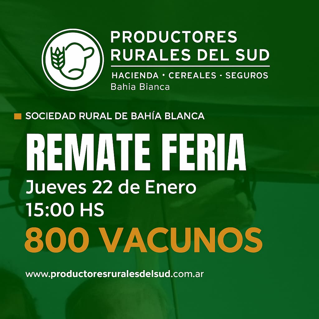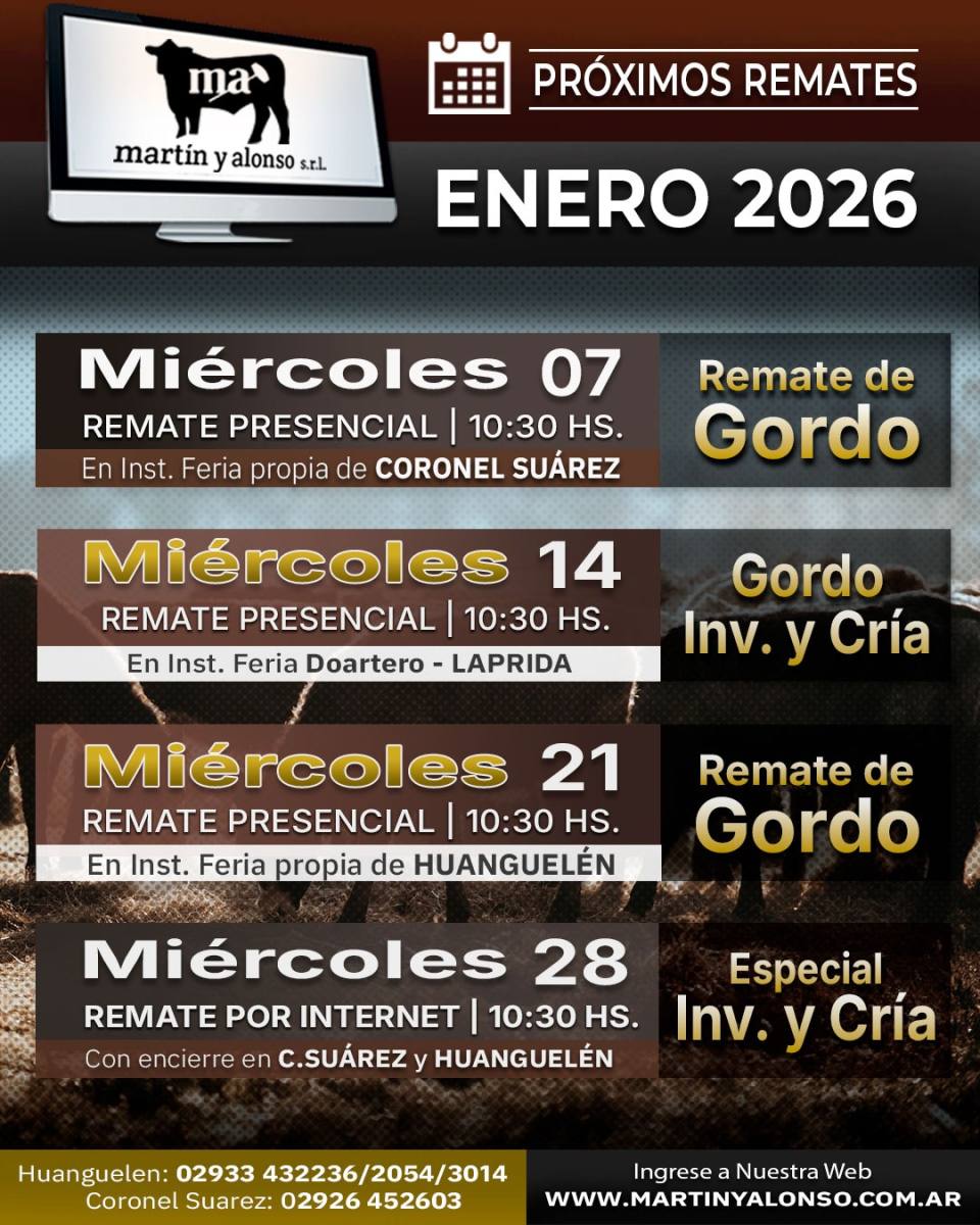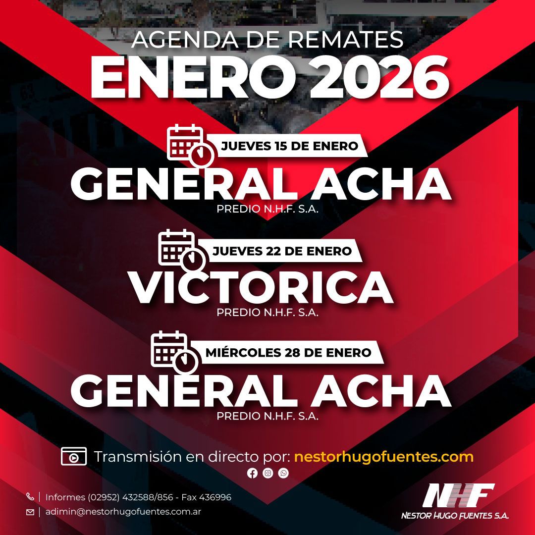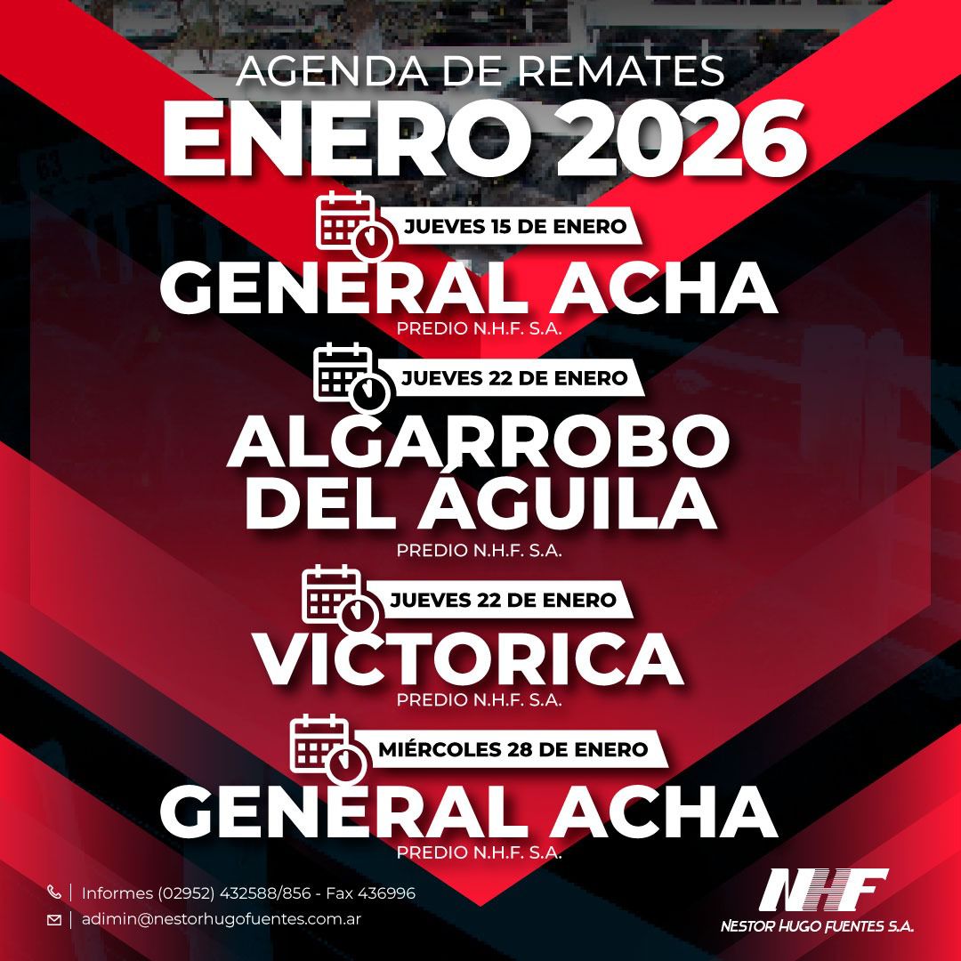 Agenda de Remates MADELAN REMATE WEB INVERNADA Y CRIA 23 de diciembre de 2025 09:30 hs. WEB PROPIA - MADELAN 2983 40-7854 Enviar E-Mail Sitio Web NESTOR HUGO FUENTES EN GENERAL ACHA GORDO, INVERNADA Y CRIA 30 de diciembre de 2025 11:00 hs. PREDIO NESTOR HUGO FUENTES 2954 47-8046 N/D Sitio Web GANADERA SALLIQUELO EN CORONEL PRINGLES GORDO, INVERNADA Y CRIA 06 de enero de 2026 15:00 hs. SOCIEDAD RURAL DE CORONEL PRINGLES 2916 42-5562 Enviar E-Mail Sitio Web MARTIN Y ALONSO - EN CORONEL SUAREZ ESPECIAL DE GORDO 07 de enero de 2026 10:30 hs. PREDIO PROPIO EN CORONEL SUAREZ +54 9 2923 64-1340 Enviar E-Mail Sitio Web GREGORIO ABERASTURI EN LA WEB INVERNADA Y CRIA 07 de enero de 2026 09:30 hs. PLAZA GANADERA 2923 53-7977 Enviar E-Mail Sitio Web VITTORI ERCAZTI EN BAHÍA BLANCA GORDO, INVERNADA Y CRIA 08 de enero de 2026 10:00 hs. SOCIEDAD RURAL DE BAHÍA BLANCA Enviar E-Mail Sitio Web GANADERA SALLIQUELO EN SALLIQUELO GORDO, INVERNADA Y CRIA 13 de enero de 2026 15:00 hs. FERIA SALLIQUELO 2392 61-3596 Enviar E-Mail Sitio Web BERTIN EN 17 DE AGOSTO GORDO, INVERNADA Y CRIA 15 de enero de 2026 15:00 hs. PREDIO FERIAL DE 17 DE AGOSTO 2923 69-4177 Enviar E-Mail N/D NESTOR HUGO FUENTES EN GENERAL ACHA GORDO, INVERNADA Y CRIA 15 de enero de 2026 11:00 hs. PREDIO NESTOR HUGO FUENTES 2954 47-8046 N/D Sitio Web OREGUI EN SAAVEDRA GORDO, INVERNADA Y CRIA 20 de enero de 2026 14:30 hs. ASOCIACION RURAL DE SAAVEDRA 2923 64-1494 Enviar E-Mail Sitio Web MARTIN Y ALONSO EN HUANGUELEN ESPECIAL DE GORDO 21 de enero de 2026 10:30 hs. FERIA DE HUANGUELEN +54 9 2923 64-1340 Enviar E-Mail Sitio Web GREGORIO ABERASTURI EN CARHUE GORDO, INVERNADA Y CRIA 21 de enero de 2026 15:00 hs. SOCIEDAD RURAL DE ADOLFO ALSINA CARHUE Enviar E-Mail Sitio Web VITTORI ERCAZTI EN LA WEB INVERNADA Y CRIA 22 de enero de 2026 09:30 hs. PLAZA GANADERA Enviar E-Mail Sitio Web PRODUCTORES RURALES DEL SUD EN BAHIA BLANCA GORDO, INVERNADA Y CRIA 22 de enero de 2026 15:00 hs. SOCIEDAD RURAL DE BAHIA BLANCA 2914 13-3125 Enviar E-Mail Sitio Web NESTOR HUGO FUENTES EN ALGARROBO DEL AGUILA GORDO, INVERNADA Y CRIA 22 de enero de 2026 14:00 hs. PREDIO NESTOR HUGO FUENTES 2954 47-8046 N/D Sitio Web MARTIN Y ALONSO EN LA WEB INVERNADA Y CRIA 28 de enero de 2026 10:30 hs. WEB PROPIA - PLAZA GANADERA +54 9 2923 64-1340 Enviar E-Mail Sitio Web COLOMBO Y MAGLIANO EN SALADILLO GORDO, INVERNADA Y CRIA 30 de enero de 2026 14:00 hs. SOCIEDAD RURAL DE SALADILLO +54 9 2914 04-2440 N/D Sitio Web Advertisement Las más leídas Agro Cosecha de cebada: un año para no dejar nada librado al azar Hacienda Movimientos de hacienda: las nuevas exigencias sanitarias de SENASA para 2026 Hacienda Carne: con la mirada en China, el 2026 abre un interrogante Hacienda En Río Cuarto, hubo mucho más que un remate Hacienda Madelán, empujando con la web
