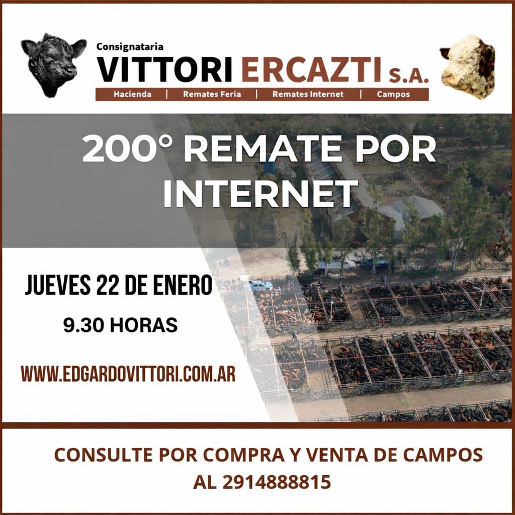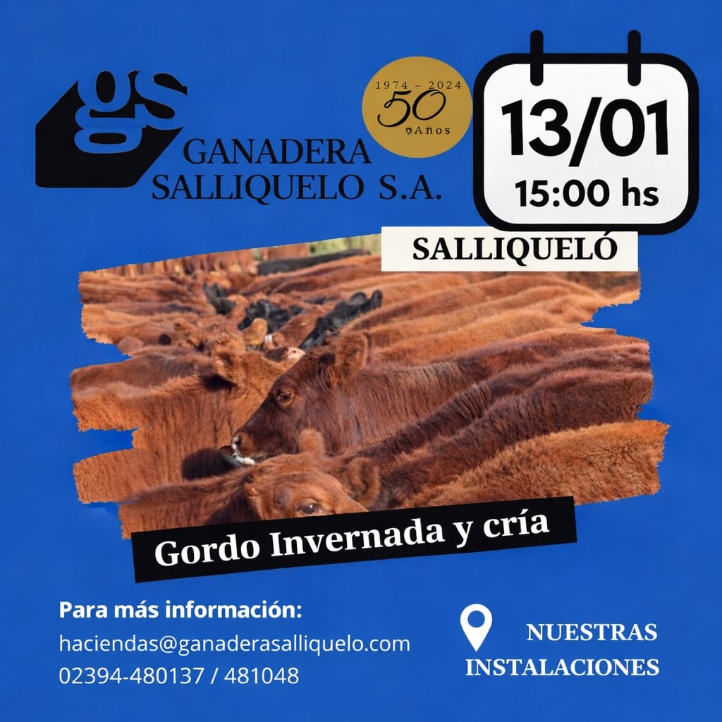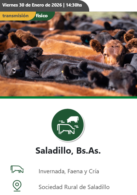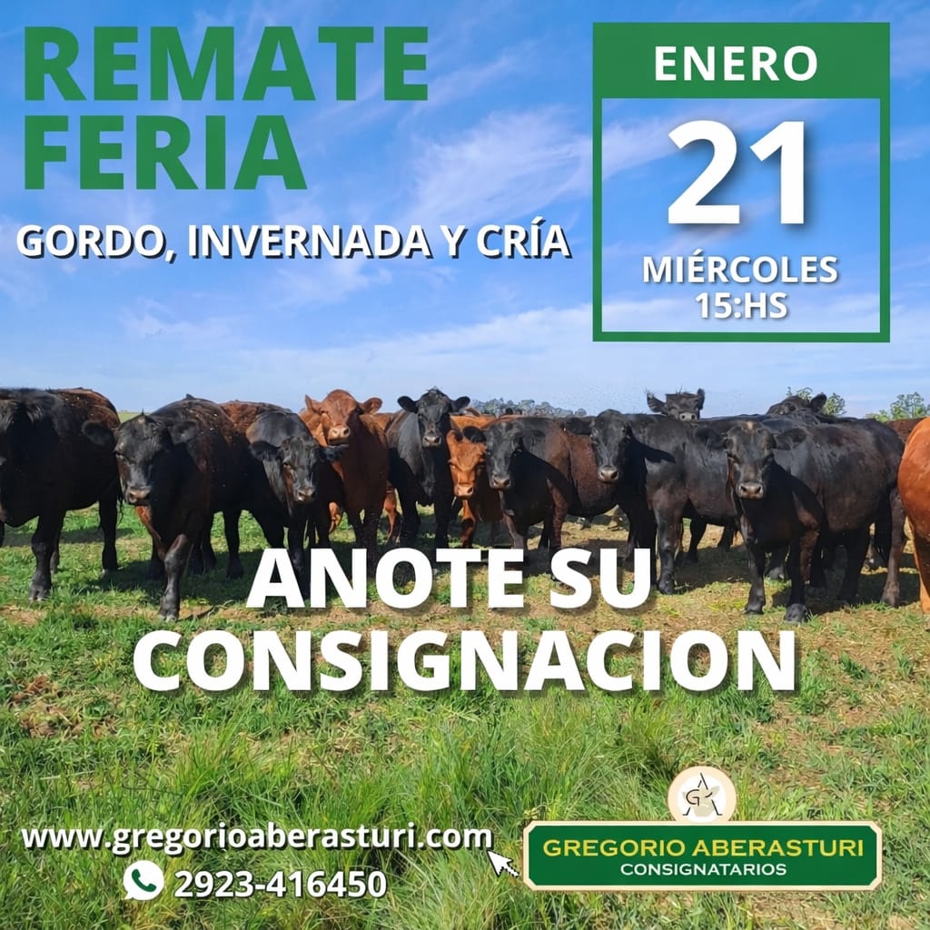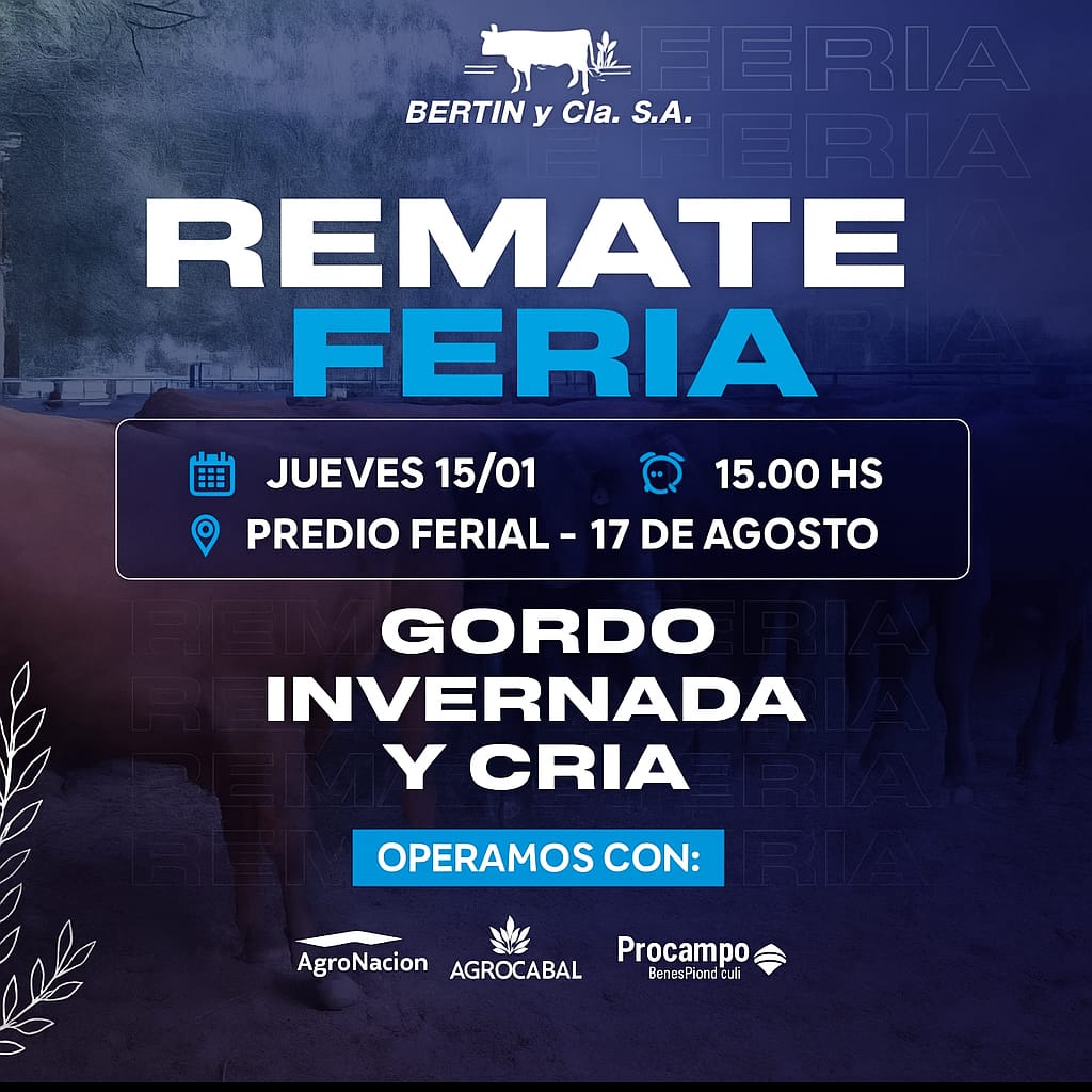 Agenda de Remates MADELAN REMATE WEB INVERNADA Y CRIA 23 de diciembre de 2025 09:30 hs. WEB PROPIA - MADELAN 2983 40-7854 Enviar E-Mail Sitio Web NESTOR HUGO FUENTES EN GENERAL ACHA GORDO, INVERNADA Y CRIA 30 de diciembre de 2025 11:00 hs. PREDIO NESTOR HUGO FUENTES 2954 47-8046 N/D Sitio Web GANADERA SALLIQUELO EN CORONEL PRINGLES GORDO, INVERNADA Y CRIA 06 de enero de 2026 15:00 hs. SOCIEDAD RURAL DE CORONEL PRINGLES 2916 42-5562 Enviar E-Mail Sitio Web MARTIN Y ALONSO - EN CORONEL SUAREZ ESPECIAL DE GORDO 07 de enero de 2026 10:30 hs. PREDIO PROPIO EN CORONEL SUAREZ +54 9 2923 64-1340 Enviar E-Mail Sitio Web GREGORIO ABERASTURI EN LA WEB INVERNADA Y CRIA 07 de enero de 2026 09:30 hs. PLAZA GANADERA 2923 53-7977 Enviar E-Mail Sitio Web VITTORI ERCAZTI EN BAHÍA BLANCA GORDO, INVERNADA Y CRIA 08 de enero de 2026 10:00 hs. SOCIEDAD RURAL DE BAHÍA BLANCA Enviar E-Mail Sitio Web GANADERA SALLIQUELO EN SALLIQUELO GORDO, INVERNADA Y CRIA 13 de enero de 2026 15:00 hs. FERIA SALLIQUELO 2392 61-3596 Enviar E-Mail Sitio Web BERTIN EN 17 DE AGOSTO GORDO, INVERNADA Y CRIA 15 de enero de 2026 15:00 hs. PREDIO FERIAL DE 17 DE AGOSTO 2923 69-4177 Enviar E-Mail N/D NESTOR HUGO FUENTES EN GENERAL ACHA GORDO, INVERNADA Y CRIA 15 de enero de 2026 11:00 hs. PREDIO NESTOR HUGO FUENTES 2954 47-8046 N/D Sitio Web OREGUI EN SAAVEDRA GORDO, INVERNADA Y CRIA 20 de enero de 2026 14:30 hs. ASOCIACION RURAL DE SAAVEDRA 2923 64-1494 Enviar E-Mail Sitio Web MARTIN Y ALONSO EN HUANGUELEN ESPECIAL DE GORDO 21 de enero de 2026 10:30 hs. FERIA DE HUANGUELEN +54 9 2923 64-1340 Enviar E-Mail Sitio Web GREGORIO ABERASTURI EN CARHUE GORDO, INVERNADA Y CRIA 21 de enero de 2026 15:00 hs. SOCIEDAD RURAL DE ADOLFO ALSINA CARHUE Enviar E-Mail Sitio Web VITTORI ERCAZTI EN LA WEB INVERNADA Y CRIA 22 de enero de 2026 09:30 hs. PLAZA GANADERA Enviar E-Mail Sitio Web PRODUCTORES RURALES DEL SUD EN BAHIA BLANCA GORDO, INVERNADA Y CRIA 22 de enero de 2026 15:00 hs. SOCIEDAD RURAL DE BAHIA BLANCA 2914 13-3125 Enviar E-Mail Sitio Web NESTOR HUGO FUENTES EN ALGARROBO DEL AGUILA GORDO, INVERNADA Y CRIA 22 de enero de 2026 14:00 hs. PREDIO NESTOR HUGO FUENTES 2954 47-8046 N/D Sitio Web MARTIN Y ALONSO EN LA WEB INVERNADA Y CRIA 28 de enero de 2026 10:30 hs. WEB PROPIA - PLAZA GANADERA +54 9 2923 64-1340 Enviar E-Mail Sitio Web COLOMBO Y MAGLIANO EN SALADILLO GORDO, INVERNADA Y CRIA 30 de enero de 2026 14:00 hs. SOCIEDAD RURAL DE SALADILLO +54 9 2914 04-2440 N/D Sitio Web Advertisement Las más leídas Agro Cosecha de cebada: un año para no dejar nada librado al azar Hacienda Movimientos de hacienda: las nuevas exigencias sanitarias de SENASA para 2026 Hacienda Carne: con la mirada en China, el 2026 abre un interrogante Hacienda En Río Cuarto, hubo mucho más que un remate Hacienda Madelán, empujando con la web