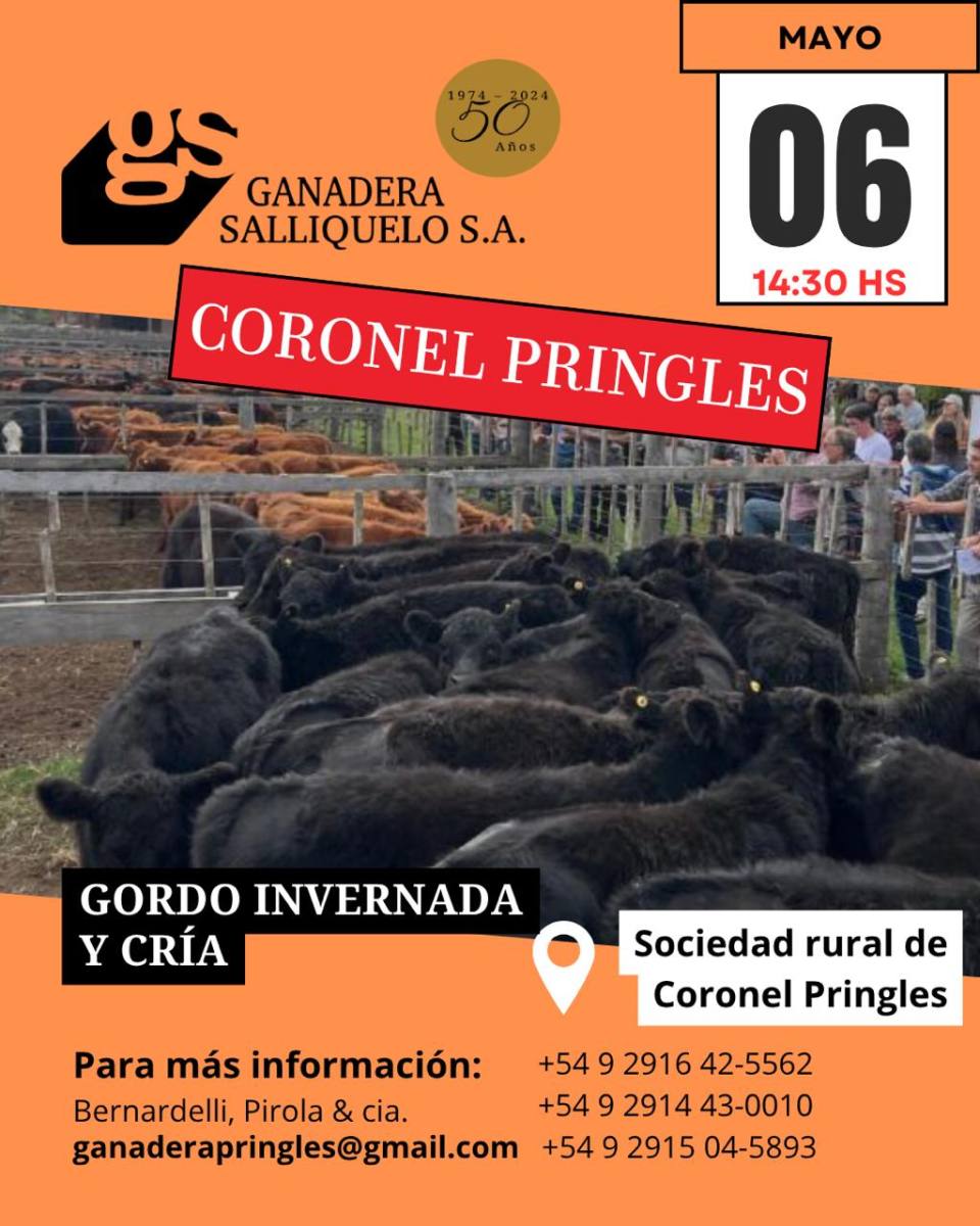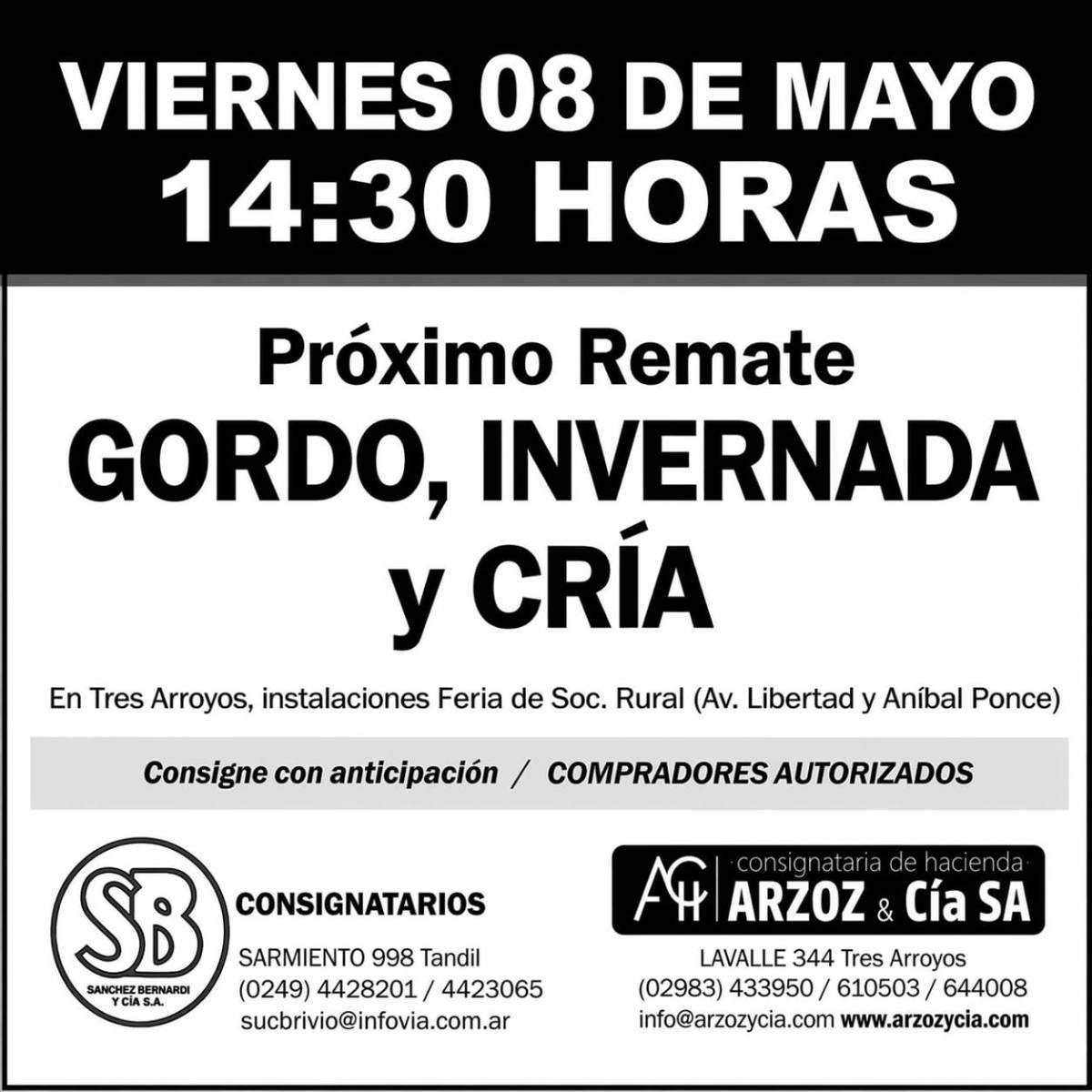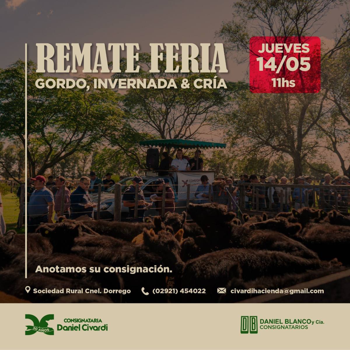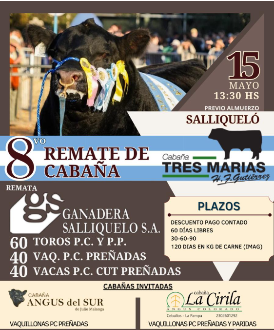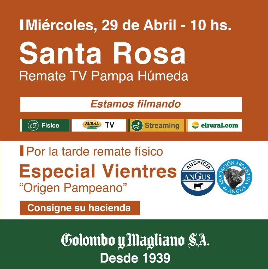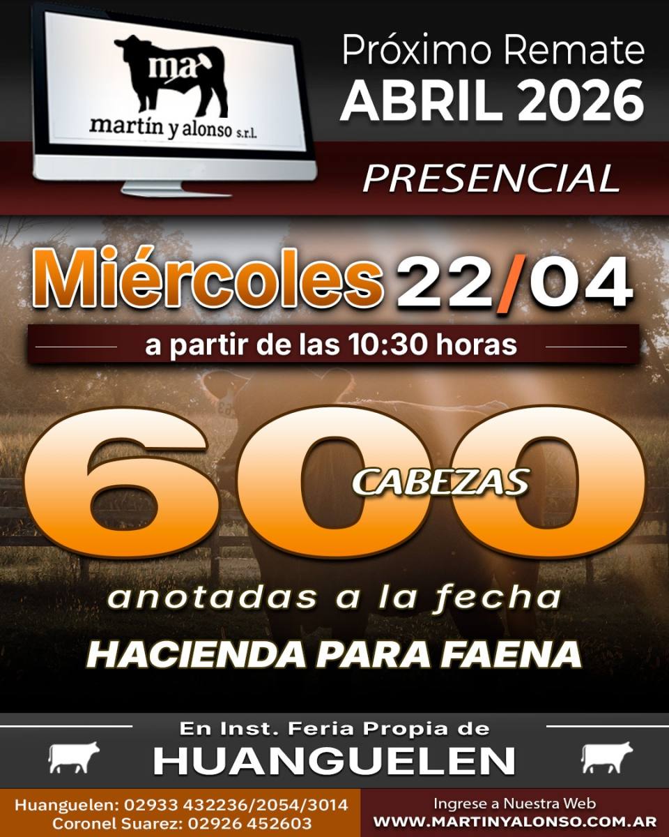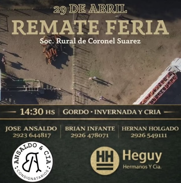 Agenda de Remates LANUSSE SANTILLAN EN TORNQUIST GORDO, INVERNADA Y CRIA 18 de abril de 2026 12:00 hs. ASOCIACIÓN RURAL DE TORNQUIST 11 6973-7363 Enviar E-Mail Sitio Web MADELAN ESPECIAL DE ZAFRA - LOS QUIRQUINCHOS GORDO, INVERNADA Y CRIA 21 de abril de 2026 09:30 hs. LOS QUIRQUINCHOS - WEB MADELAN 2983 40-7854 N/D Sitio Web COLOMBO Y MAGLIANO EN RAUCH GORDO, INVERNADA Y CRIA 21 de abril de 2026 14:00 hs. SOCIEDAD RURAL DE RAUCH 2914 04-2440 N/D Sitio Web MARTIN Y ALONSO EN GUAMINI GORDO, INVERNADA Y CRIA DIFERIDO POR LLUVIAS 21 de abril de 2026 10:30 hs. UNION DE GANADEROS 2923 64-1340 Enviar E-Mail Sitio Web GREGORIO ABERASTURI EN CARHUE GORDO, INVERNADA Y CRIA 22 de abril de 2026 15:00 hs. SOCIEDAD RURAL DE ADOLFO ALSINA CARHUE Enviar E-Mail Sitio Web MARTIN Y ALONSO EN HUANGUELEN ESPECIAL DE GORDO 22 de abril de 2026 10:30 hs. HUANGUELEN 2923 64-1340 Enviar E-Mail Sitio Web COLOMBO Y MAGLIANO EN CHASCOMUS GORDO, INVERNADA Y CRIA 23 de abril de 2026 14:30 hs. SOCIEDAD RURAL DE CHASCOMUS 2914042440 N/D Sitio Web LANUSSE SANTILLAN EN PEHUAJO GORDO, INVERNADA Y CRIA 23 de abril de 2026 11:00 hs. SOCIEDAD RURAL DE PEHUAJO 11 6973-7363 Enviar E-Mail Sitio Web VITTORI ERCAZTI EN LA WEB INVERNADA Y CRIA 23 de abril de 2026 09:30 hs. SOCIEDAD RURAL DE BAHÍA BLANCA 2916 42-0950 Enviar E-Mail Sitio Web CAMPOS Y GANADOS DESDE CLARAZ GORDO, INVERNADA Y CRIA DIFERIDO AL 23/04 23 de abril de 2026 14:00 hs. FERIA CLARAZ 11 2774-7441 N/D Sitio Web ALFREDO S MONDINO - OLAVARRIA GORDO, INVERNADA Y CRIA 23 de abril de 2026 11:00 hs. SOCIEDAD RURAL DE OLAVARRIA 2923578916 N/D Sitio Web GANANOR PUJOL - 3° REMATE DEL SUDOESTE BONAERENSE INVERNADA Y CRIA 23 de abril de 2026 17:00 hs. CORONEL SURAREZ POLO CLUB - STREAMING 11 6655-0551 N/D Sitio Web NESTOR HUGO FUENTES EN REALICO GORDO, INVERNADA Y CRIA DIFERIDO POR LLUVIAS AL VIERNES 24 24 de abril de 2026 10:00 hs. REALICO- PREDIO NHF 2954 47-8046 Enviar E-Mail Sitio Web BRANDEMANN EN LA WEB INVERNADA Y CRIA ATENCIÓN: HOTEL CRISTAL 24 de abril de 2026 11:00 hs. CASTEX - POR PANTALLA- HOTEL CRISTAL 2916 42-2918 N/D Sitio Web COLOMBO Y MAGLIANO EN OLAVARRIA GORDO, INVERNADA Y CRIA ATENCIÓN: REPROGRAMADO POR LLUVIAS 24/04 24 de abril de 2026 14:00 hs. SOCIEDAD RURAL DE OLAVARRIA +54 9 2914 04-2440 N/D Sitio Web PRODUCTORES RURALES DEL SUD EN BAHIA BLANCA GORDO, INVERNADA Y CRIA REMATE 13° ESPECIAL DE ANGUS 29 de abril de 2026 14:30 hs. ASOCIACIÓN DE GANADEROS Y AGRICULTORES- CANAL RURAL 2914 13-3125 Enviar E-Mail Sitio Web COLOMBO Y MAGLIANO EN SANTA ROSA GORDO, INVERNADA Y CRIA 29 de abril de 2026 10:00 hs. SANTA ROSA - SOCIEDAD RURAL DE SANTA ROSA- CANAL RURAL 2914 04-2440 N/D Sitio Web ANSALDO Y CIA - EN CORONEL SUAREZ GORDO, INVERNADA Y CRIA 29 de abril de 2026 14:30 hs. SOCIEDAD RURAL DE CORONEL SUAREZ 2923 64-4817 N/D Sitio Web ALFREDO S MONDINO - ESPECIAL DESTETE RAUCH FAENAR, INVERNADA Y CRIA 30 de abril de 2026 11:00 hs. SOCIEDAD RURAL DE RAUCH 2923 57-8916 N/D Sitio Web 50° EXPOSICIÓN RURAL DE TORNQUIST 2° CONCURSO Y VENTA DE TERNEROS DEL SO 01 de mayo de 2026 10:00 hs. ASOCIACIÓN RURAL DE TORNQUIST 2916 43-3130 Enviar E-Mail Sitio Web ECHEGUIA HERMANOS EN TORNQUIST EN EL MARCO DEL 2° CONCURSO DEL TERNERO DEL SO 04 de mayo de 2026 11:00 hs. ASOCIACIÓN RURAL DE TORNQUIST 2916 43-3130 N/D Sitio Web OREGUI EN SAAVEDRA GORDO, INVERNADA Y CRIA ATENCIÓN POSTERGADO POR LLUVIAS. 05 de mayo de 2026 10:30 hs. ASOCIACION RURAL DE SAAVEDRA 2923 64-1494 Enviar E-Mail Sitio Web ALFREDO S MONDINO - ESPECIAL DE VACAS TELEVISADO PAMPA HUMEDA 05 de mayo de 2026 11:00 hs. CANAL RURAL 2923 57-8916 N/D Sitio Web 1° REMATE ESPECIAL DE OTOÑO - ANGUS DEL SUR DON FIOTO - STROEDER 06 de mayo de 2026 14:00 hs. STROEDER - INSTALACIONES DE LA COOPERATIVA 2920 32-7445 Enviar E-Mail N/D GREGORIO ABERASTURI EN LA WEB INVERNADA Y CRIA 06 de mayo de 2026 09:30 hs. PLAZA GANADERA - WEB PROPIA 2923 53-7977 Enviar E-Mail Sitio Web GANADERA SALLIQUELO EN CORONEL PRINGLES GORDO, INVERNADA Y CRIA 06 de mayo de 2026 14:30 hs. SOCIEDAD RURAL DE CORONEL PRINGLES 2916 42-5562 Enviar E-Mail Sitio Web COLOMBO Y MAGLIANO EN CHASCOMUS GORDO, INVERNADA Y CRIA 06 de mayo de 2026 14:30 hs. SOCIEDAD RURAL DE CHASCOMUS 0291-4042440 N/D Sitio Web VITTORI ERCAZTI EN BAHÍA BLANCA GORDO, INVERNADA Y CRIA 07 de mayo de 2026 10:00 hs. SOCIEDAD RURAL DE BAHÍA BLANCA 2916 42-0950 Enviar E-Mail Sitio Web BALLESTER HNOS - SEGUNDO REMATE EN VILLA IRIS GORDO, INVERNADA Y CRIA 08 de mayo de 2026 14:30 hs. PREDIO JUAN MANUEL GARCIARENA - VILLA IRIS 2916 41-1704 Enviar E-Mail Sitio Web ARZOZ EN TRES ARROYOS GORDO, INVERNADA Y CRIA 08 de mayo de 2026 14:30 hs. PREDIO FERIAL DE TRES ARROYOS 2983 61-0503 N/D Sitio Web GANADERA SALLIQUELO EN SALLIQUELO GORDO, INVERNADA Y CRIA 12 de mayo de 2026 14:30 hs. PREDIO FERIAL EN SALLIQUELO 2392 62-9069 Enviar E-Mail Sitio Web CIVARDI Y BLANCO EN CORONEL DORREGO GORDO, INVERNADA Y CRIA 14 de mayo de 2026 11:00 hs. SOCIEDAD RURAL DE CORONEL DORREGO 2921 40-7015 Enviar E-Mail N/D LAS "MAS" DE DELFINAGRO CABAÑA LAS BLANCAS DESDE LAS FLORES 14 de mayo de 2026 12:30 hs. SOCIEDAD RURAL DE LAS FLORES 11 6671-7021 N/D Sitio Web BERTIN EN 17 DE AGOSTO GORDO, INVERNADA Y CRIA 15 de mayo de 2026 15:00 hs. PREDIO FERIAL DE 17 DE AGOSTO 2923 69-4177 Enviar E-Mail N/D 8° REMATE DE OTOÑO DE CABAÑA TRES MARIAS EN CONJUNTO CON GANADERA SALLIQUELO CABAÑAS INVITADAS: LA CIRILA - ANGUS DEL SUR 15 de mayo de 2026 13:30 hs. PREDIO PROPIO EN SALLIQUELO 2916 41-1704 Enviar E-Mail Sitio Web GANADERA SALLIQUELO EN CORONEL DORREGO GORDO, INVERNADA Y CRIA 20 de mayo de 2026 14:30 hs. SOCIEDAD RURAL DE CORONEL DORREGO 2916 41-1750 Enviar E-Mail Sitio Web ALFREDO S MONDINO - GRAN REMATE ANUAL ANGUS EXPO PALERMO DE OTOÑO - 5° CONCURSO FAENA ANGUS 21 de mayo de 2026 11:00 hs. SOCIEDAD RURAL DE PALERMO - CANAL RURAL 2923 57-8916 N/D Sitio Web ALFREDO S MONDINO - VENTA DE CAMPEONES VENTAS DE LOS CAMPEONES DE OTOÑO ANGUS 22 de mayo de 2026 19:00 hs. SOCIEDAD RURAL DE PALERMO - CANAL RURAL